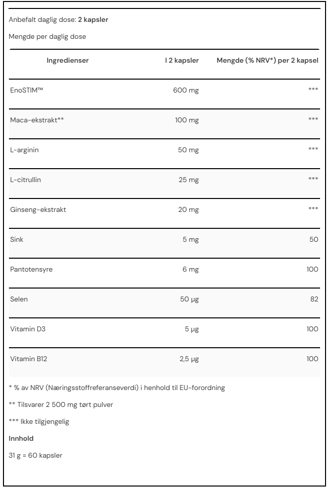EnoSTIM™ [Blanding av ekstrakt av druekvas (Vitis vinifera L.), ekstrakt av epleskall (Malus pumila Mil.) og safran (Crocus sativus L.) stigmapulver med minst 90 % totale polyfenoler (inneholder svoveldioksid og sulfitter > 10 mg/kg)]; Kapselskall: belegningsmiddel (hypromellose), fargestoff (briljantsvart); Maca-rotekstrakt (Lepidium meyenii Walp.) med 2. 5% beta-sitosterol; maisstivelse; L-arginin; sinkbisglycinat; L-citrullin; kokosmelkpulver (Cocos nucifera L.); ginsengrotekstrakt (Panax Ginseng C.A.Mey.) med 6% ginsenosider; bambusskuddekstrakt (Bambusa vulgaris Schrad. ex. J.C.Wendl.) med 75 % naturlig silika; L-selenometionin; D-pantotenat, kalsium (pantotensyre); Cholecalciferol (vitamin D); Metylkobalamin (vitamin B12).